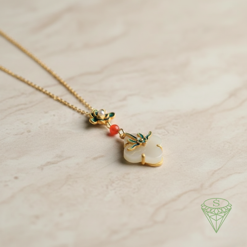 Meet the Enchanted Luck: This pendant is a detailed story, beautifully told. It starts with the centerpiece: a luminous White Jade Clover/Four-Petal Charm. This jade is then adorned with hand-painted Blue-Green Enamel Detailing that catches the light and adds a fresh, vibrant pop. The entire piece is layered, featuring a beautiful floral cap and a striking Red Coral/Bead detail above the main pendant.
